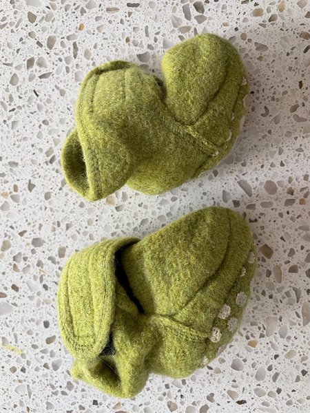 Ett par gröna ulltossor med dekorativa detaljer. Osäker på storleken men passar nyfödd upp till ca sex månader