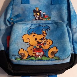Gul ryggsäck med blå detaljer och ett tryck av en kanin med texten "PAX". Den har ett mindre fack med dragkedja på framsidan och justerbara axelband. Köparen står för frakten.