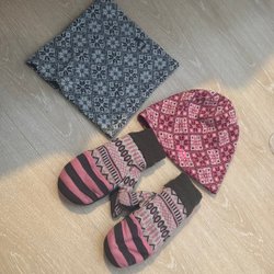 Här är ett set med tre par vantar i olika färger och mönster. Ett par är svarta, ett par är grågröna och det tredje paret är mörkblå med ljusblå och vita ränder. Svarta är ica tror jag övriga två PoP