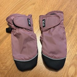 Ett par lila vantar med svarta förstärkningar på handflatan och tummen. Vantarna har resår vid handleden och ett justerbart kardborreband för en säker passform. Logotypen ”FIX” finns synlig på kardborrebandet.