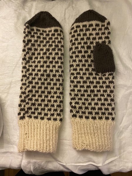 Ett par stickade vantar i ett mönster av mörkbrunt och benvitt. Muddarna är i benvitt och slätstickade. Tummen är mörkbrun.Handsticjade i suoerwash ull. Storlek Herr/Dam