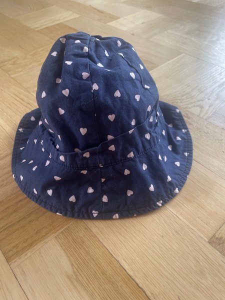 Söt, mörkblå solhatt med ljusrosa hjärtan.