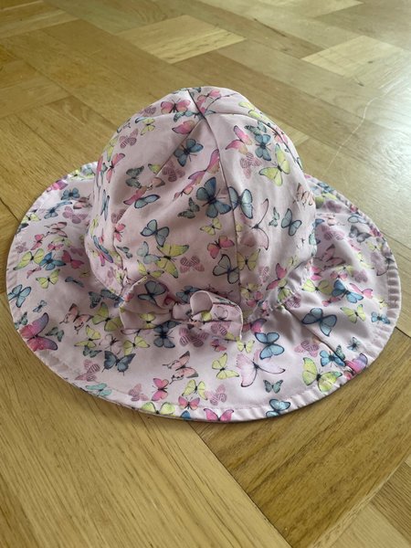 Söt rosa solhatt med fjärilsmönster och en liten rosett framtill. Perfekt för att skydda barnets huvud från solen.