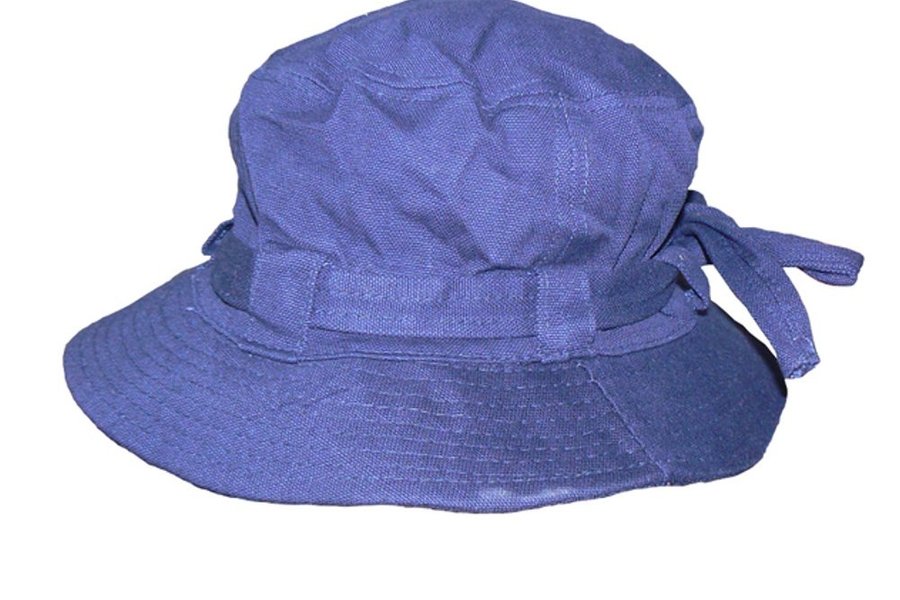 Enfärgad blå solhatt med brett brätte runt hela hatten.