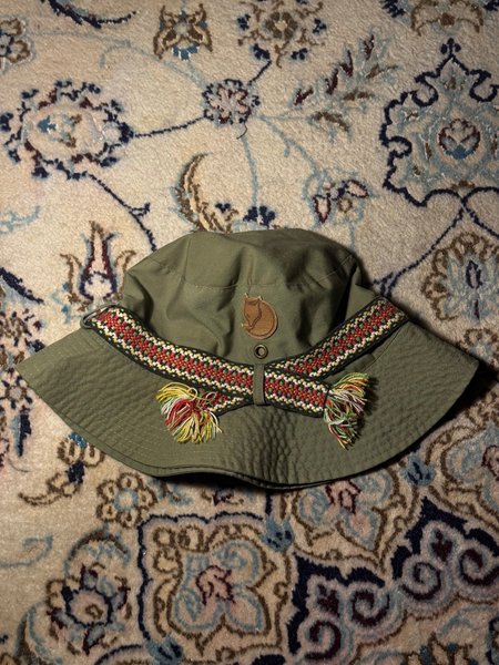 En olivgrön solhatt med en dekorativ rem runt kullen. Remmen har ett mönster i rött, gult, vitt och svart, samt tofsar i samma färger. På hattens framsida finns en liten läderdetalj med en präglad logotyp.