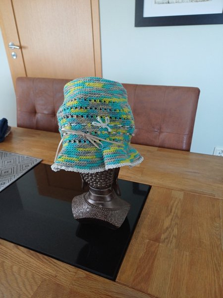 En virkad hatt i en blandning av turkos, gul och grå nyanser. Hatten har ett dekorativt band runt kanten och en liten rosett framtill.