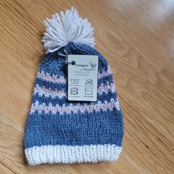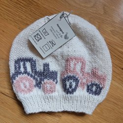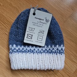 Handstickad mössa i mörkt orange och grönt marinoull, en höstig mössa! Strl ca 0-3mån.