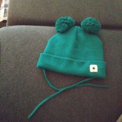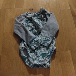 Grå tjockare mössa med dinosaurier och tofs på toppen. Mössan har även knytband och extra öron flärpar.