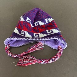 Röd stickad mössa från GAP, med en stor tofs upptill. Mössan har ett ribbat mönster och en vikt kant. Akrylull.