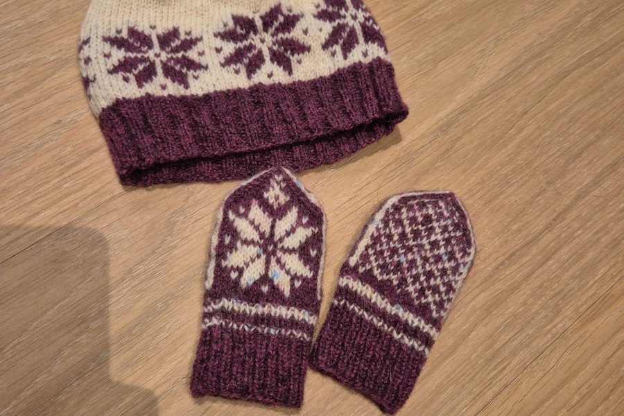 Ett stickat set i ull med en mössa och ett par vantar. Mössan är vit med ett lila mönster och en lila kant. Vantarna är lila med ett vitt mönster.