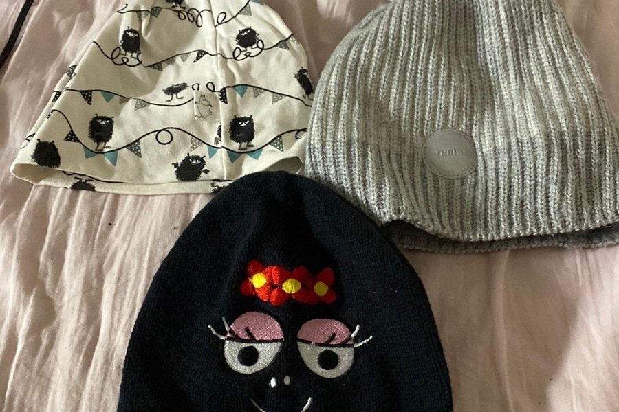 Tre mössor, en grå Reima mössa med en tofs, en svart Barbapapa mössa och en vit mössa med figurer.