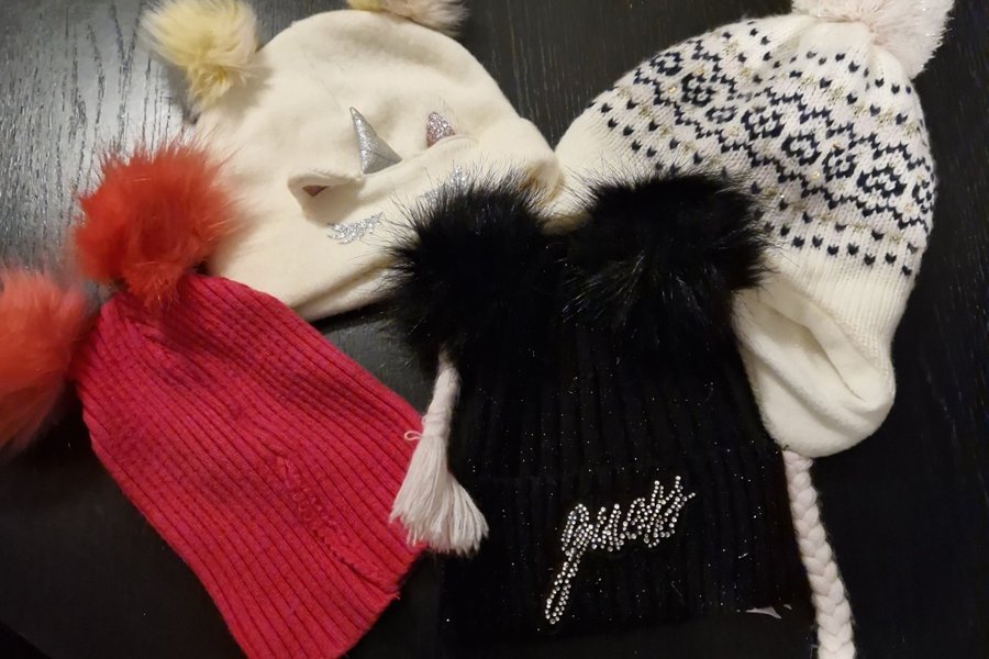 Här är ett set med fyra söta mössor. En vit mössa med ett enhörningshorn och en fluffig tofs, en vit mössa med ett mönster och en stor tofs, en svart mössa med text och en fluffig tofs, och en röd ribbad mössa med en tofs.