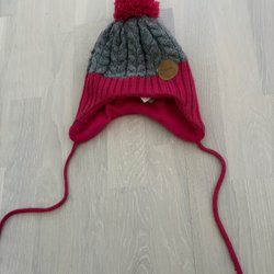 En stilren grå stickad mössa med en dekorativ patch framtill. Perfekt för att hålla värmen under kyliga dagar.