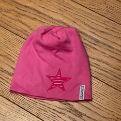 Söt rosa mössa med en liten broderad figur framtill och en mörkare kant nedtill.
