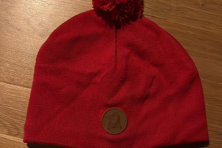 Röd mössa med en stor tofs upptill. Mössan har en rund, brun etikett med en fågel på framsidan.