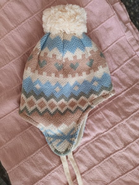 Stickad mössa med tofs och knytband. Mössan har ett mönster i blått, vitt, brunt och grått. Storlek 42/44.