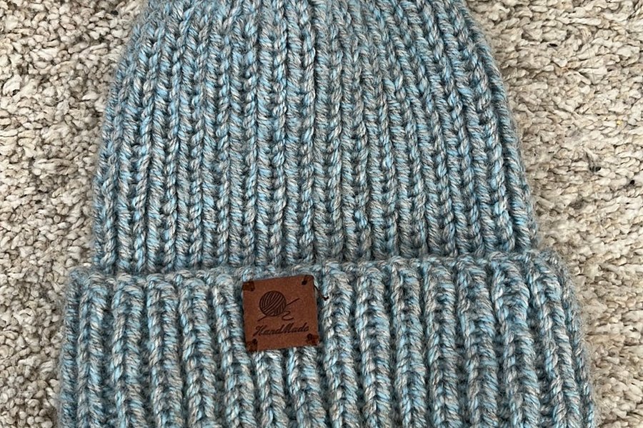 Stickad mössa med ribbstickning och en liten ”Handmade” etikett. Använda enstaka gång.