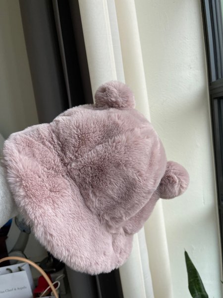En fluffig rosa mössa med två pom-poms på toppen, som liknar öron. Mössan har en mjuk och lurvig textur över hela ytan. Aldrig använd! Men prislappen är borttagen