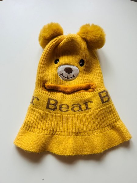 Söt gul stickad balaclava med björnansikte och texten ”Bear”. Den har två små tofsar upptill.
