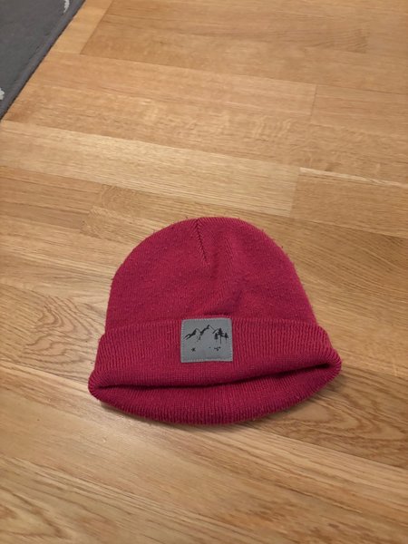 En rosa stickad mössa med en grå patch med ett motiv av berg och träd.