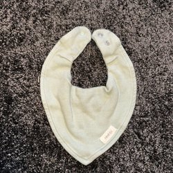 Söt haklapp från Polarn O. Pyret med ett tryck av ett djuransikte på framsidan. Haklappen har en beige bottenfärg och knäpps med tryckknappar i nacken.