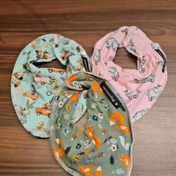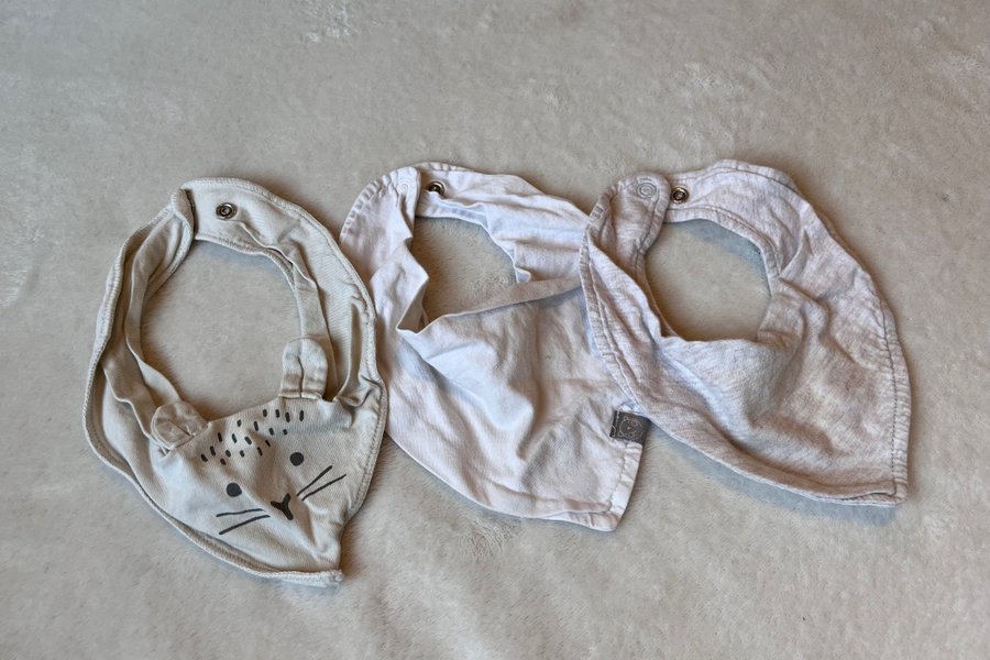 Tre dregglisar i ljusa nyanser. En dregglis är enfärgad vit, en är beigemelerad och en har ett tryck av ett djuransikte med små öron upptill. Alla dregglisar har tryckknappar bak i nacken för enkel justering och knäppning.