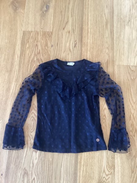 Svart blus med prickar och volangdetaljer framtill. Blusen har långa ärmar i transparent tyg med volang vid handleden.