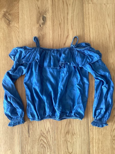 Blå långärmad blus i tunt jeanstyg med volanger och axelband.