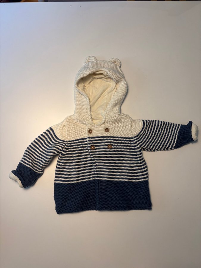 Söt stickad kofta med huva och öron från M&S. Randig i blått och vitt med träknappar. Fodrad med ett mjukt foder. Väldigt fint skick. Katt finns i hemmet men ej varit vid kläderna
