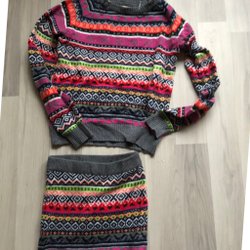 Finstickad kofta med dragkedja framtill. Den har ett randigt mönster i rosa och gula nyanser.