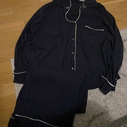 Mörkblå kofta med knappar framtill och två fickor.