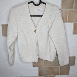 Vit, stickad kofta med v-ringning och knäppning framtill. Långa ärmar.