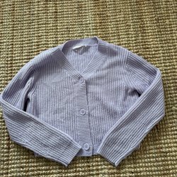 Lila stickad kofta med ett fint mönster. Koftan har långa ärmar och en ribbstickad kant.