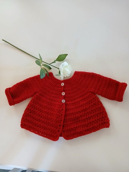 Röd, virkad babykofta med tre knappar framtill och långa ärmar. 0-3 månader. 100 % akrylgarn.