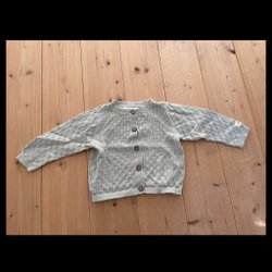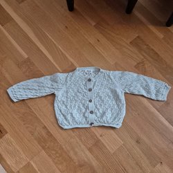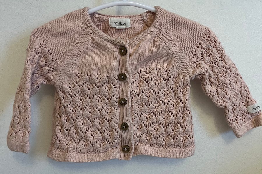 En stickad kofta för baby i en ljusrosa nyans. Koftan har en rund halsringning och knäpps med fem bruna knappar framtill.