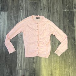 Rosa stickad kofta med flätmönster framtill och på ärmarna. Koftan har knappar fram.