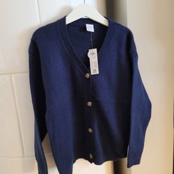 i en mörkblå nyans med trä knappar framtill. Koftan har en rundad halsringning och långa ärmar med muddar. Nederkanten är också ribbstickad.