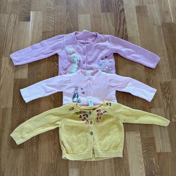 Hej! Vad kul att du besöker min annons. Jag säljer tre ljuvligt söta koftor med kaniner och annan broderi fint använt skick storlek 12 mån och 18 mån inga hål eller fläckar Peter rabbit och Next