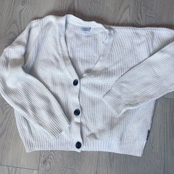 Vit, stickad kofta med v-ringning och knäppning framtill. Långa ärmar.