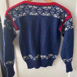 Röd stickad tröja med ett traditionellt norskt mönster runt halsen, bröstet och nederkanten. Tröjan har långa ärmar och en rund halsringning