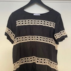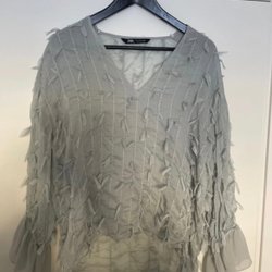 Söt stickad tröja med rund halsringning och flerfärgade detaljer. Tröjan har långa ärmar och en vågig kant.