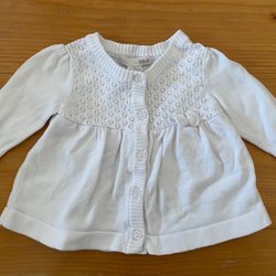 Vit stickad tröja med ett grått mönster runt halsen och nederkanten. På framsidan finns en grå bild av ett djur.
