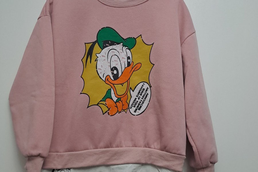 Rosa tröja med långa ärmar och tryck av en seriefigur. Under tröjan sticker en vit t-shirt fram med samma seriefigur tryckt på den.