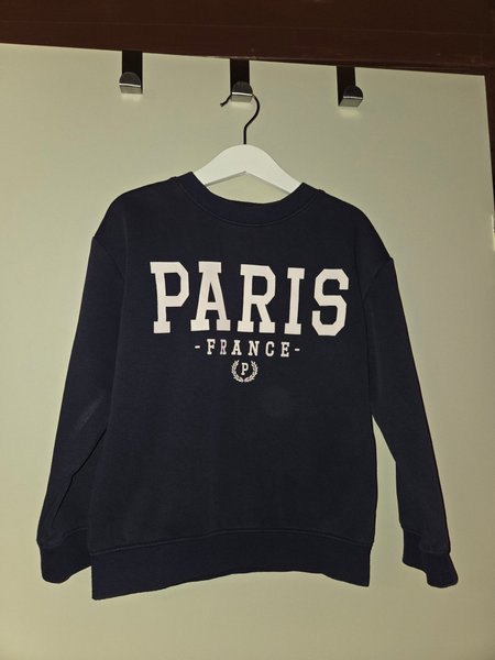 Mörkblå sweatshirt med texten "PARIS - FRANCE" tryckt i vitt på framsidan. Tröjan har långa ärmar och muddar vid ärmslut och nederkant.