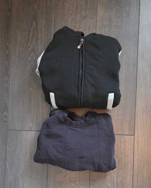 Tjock tröj / jacka med teddyinsida. Storlek 4y. Svart tröja 110 men liten i Storlek. Skulle säga Båda 104.