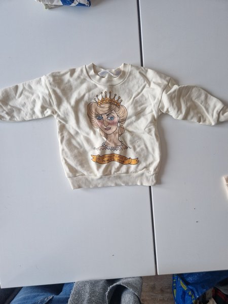 Tröja med långa ärmar och rund halsringning. Tröjan har ett tryck av en kvinna med krona och pärlhalsband, samt texten "IN LOVING MEMORY OF PRINCESS DIANA" på ett band under bilden.