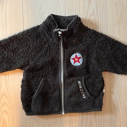 Skogsgrön / mossgrön mjuk munkjacka i velour med en ficka framtill och muddar vid ärmslut och nederkant. Luva med dragsko. Använd av ett barn ett fåtal gånger.