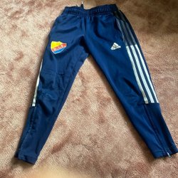Beige fleecejacka med dragkedja fram och en liten logotyp på bröstet. Jackan har en hög krage och muddar med tumhål. Nyskick. Storlek 130