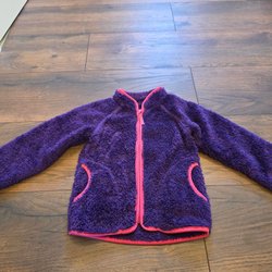 Fleecejacka med leopardmönster i svart, vitt och rött. Jackan har en rosa dragkedja och rosa detaljer runt kragen, ärmarna och nederkanten. Den har även två fickor fram.