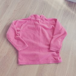 Röd fleecejacka med dragkedja och två fickor fram. Jackan har en mörkare röd färg på ärmarna och nedre delen av jackan